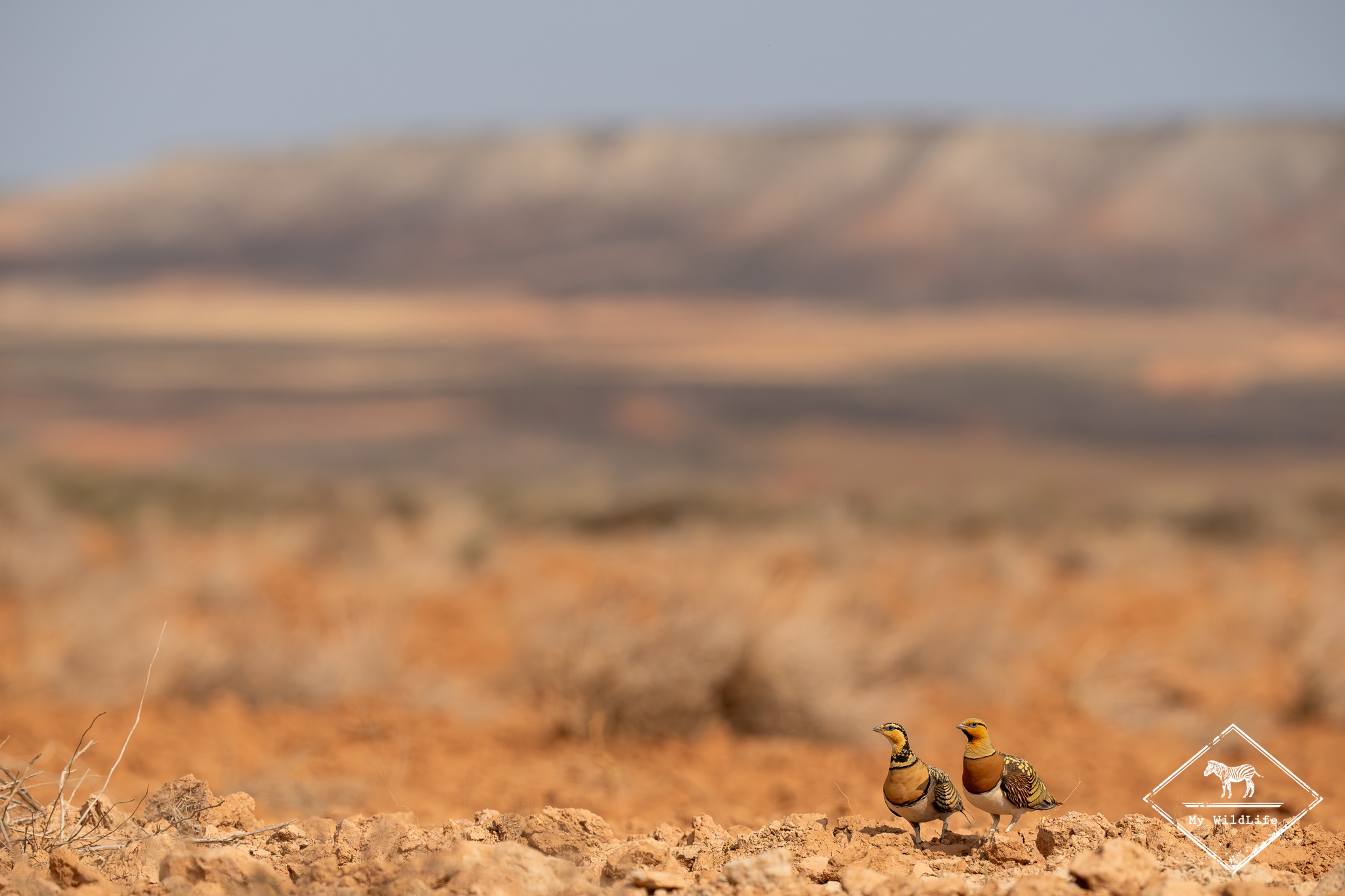 Le premier ganga à venir devant l’affût est un ganga cata mâle. Il est 8h45. Il ne restera qu’une poignée de secondes. Trois minutes plus tard une pie-grièche méridionale fera une première apparition. Elle reviendra un peu plus tard dans la matinée se toiletter. Au même moment un couple de gangas catas s’approchent furtivement sur notre gauche. Ils avancent doucement dans notre direction. Ils sont assez difficiles à repérer au milieu de la steppe semi-aride.