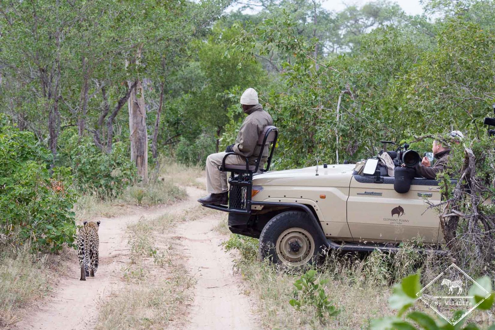 Les safaris s’effectuent dans des 4×4 ouverts. À l’avant du véhicule, Rifos, mon tracker et Sean mon guide. Passionnés de nature et de vie sauvage, du plus petit des insectes au léopard, ils connaissent le territoire comme leur poche. Très pros, ils sont aussi adorables et aiment partager leurs connaissances. Je n’ai jamais entendu un ranger parler de l’impala comme a pu le faire Sean. Ils sont extras !